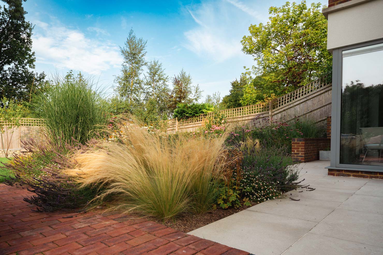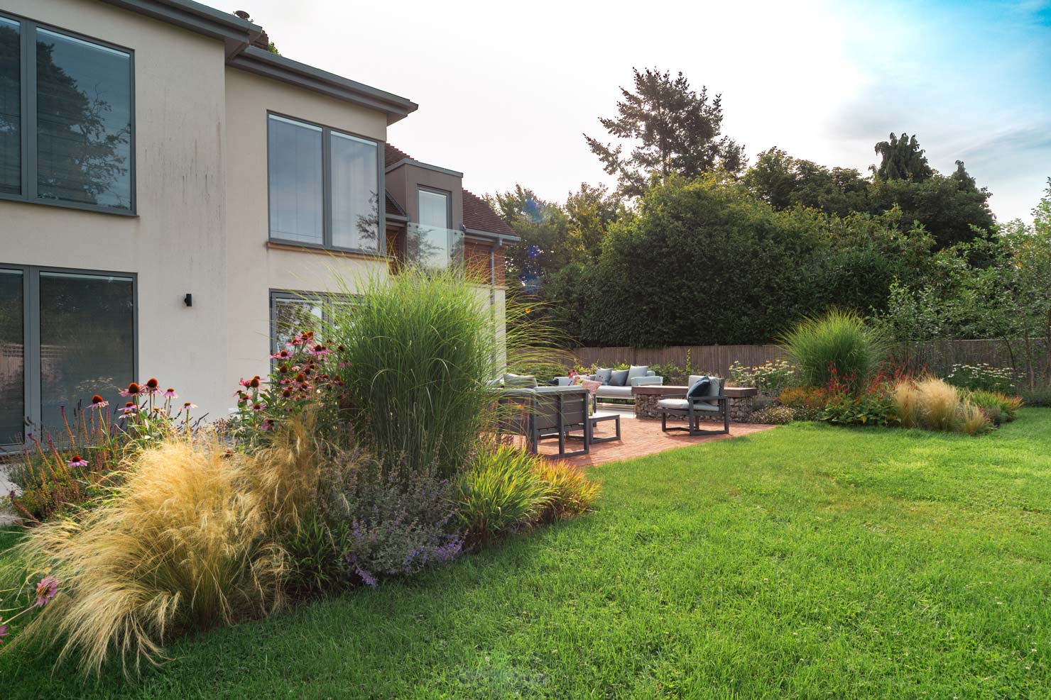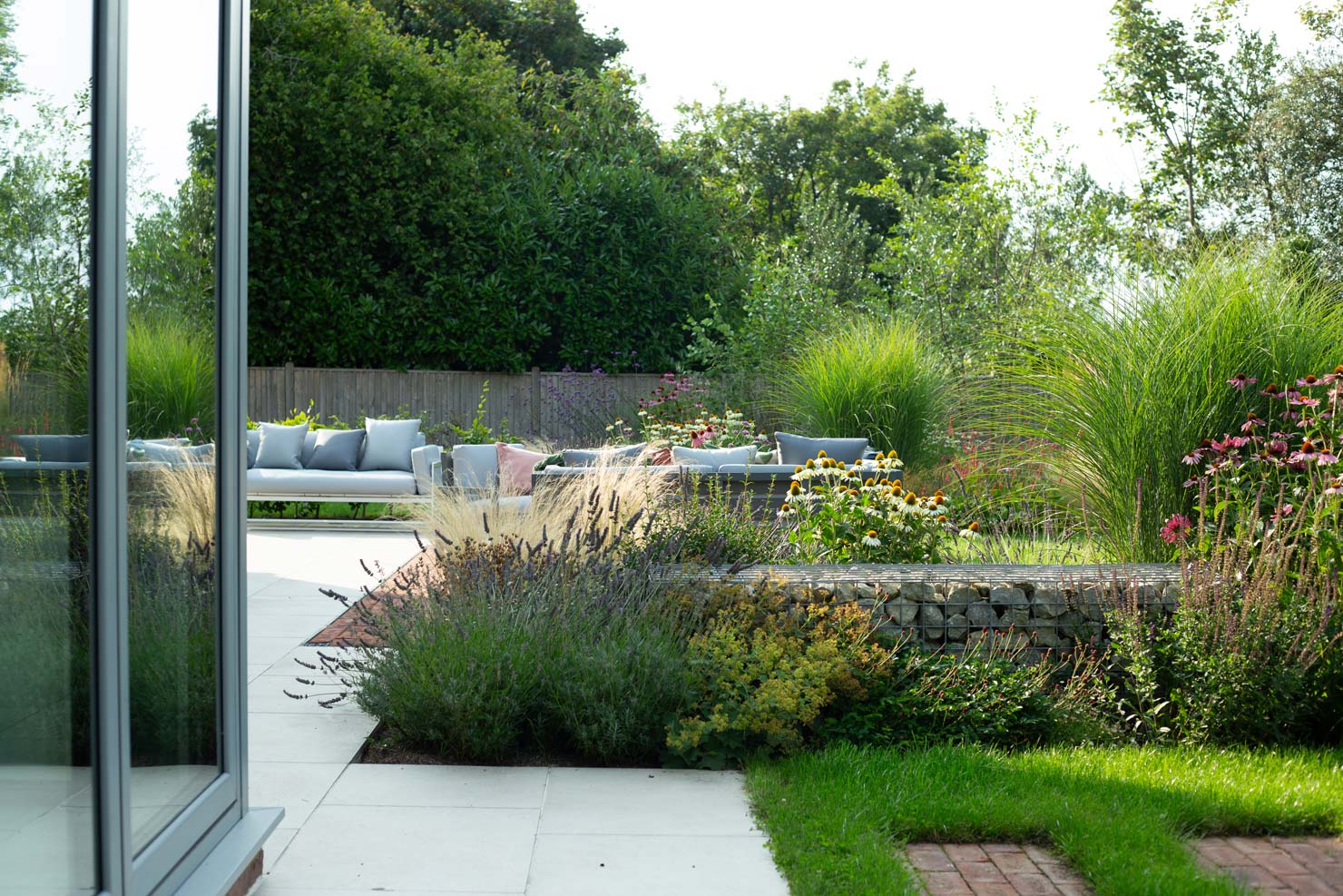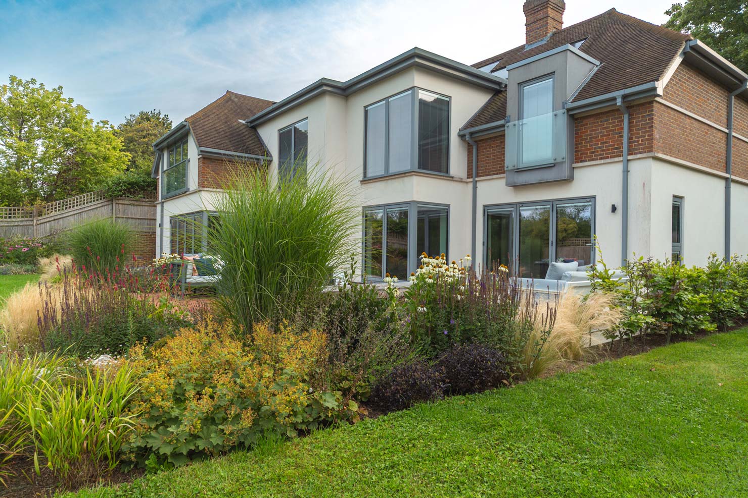 Countryside vista is a garden that softens and harmonises the handsome, contemporary house that it belongs to.  Plant borders in rectangles of differing sizes mimic the striking windows of the modern house and are planted with abundant, softening plants that blend and harmonise the house into its surroundings.  A cream porcelain patio and a red brick terrace extend the entertaining area and tall river birch trees frame the East Sussex countryside views beyond.