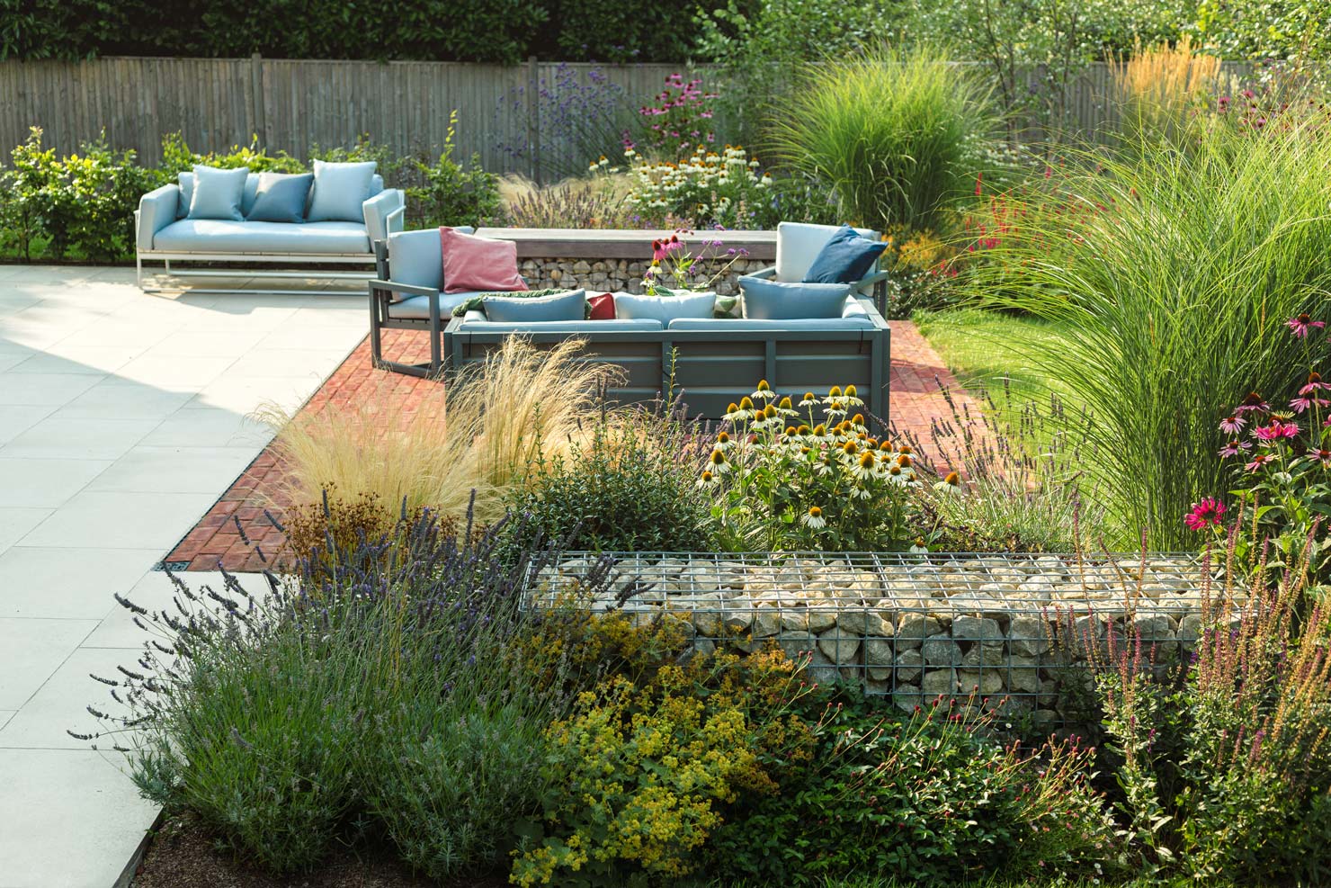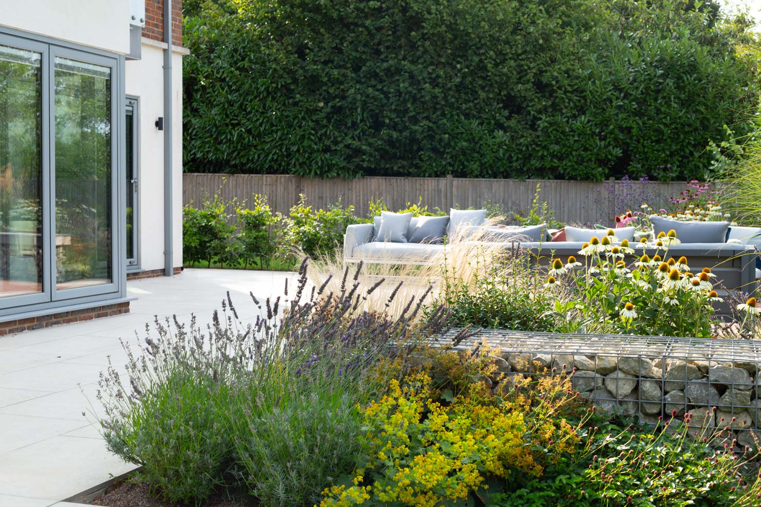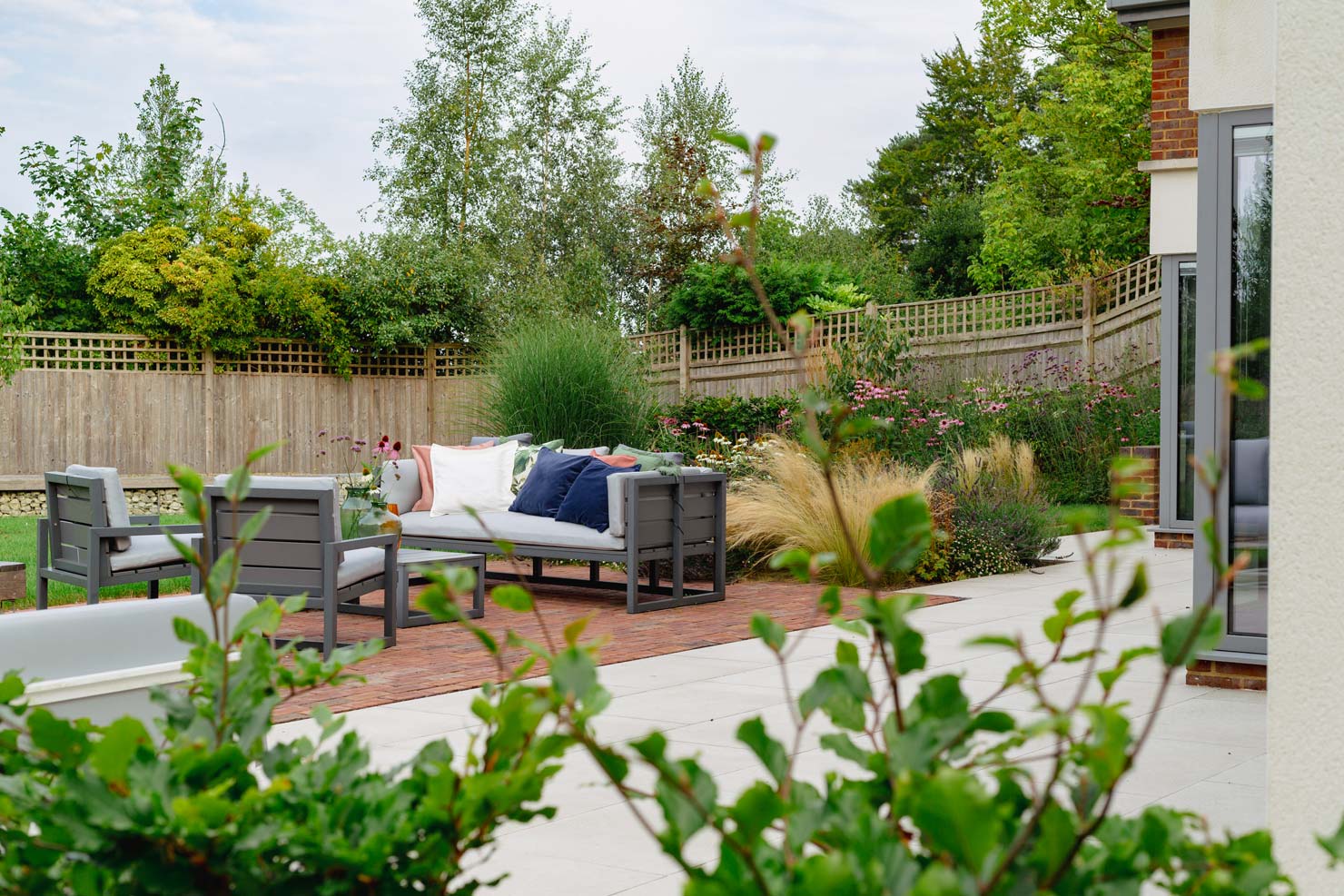 Countryside vista is a garden that softens and harmonises the handsome, contemporary house that it belongs to.  Plant borders in rectangles of differing sizes mimic the striking windows of the modern house and are planted with abundant, softening plants that blend and harmonise the house into its surroundings.  A cream porcelain patio and a red brick terrace extend the entertaining area and tall river birch trees frame the East Sussex countryside views beyond.