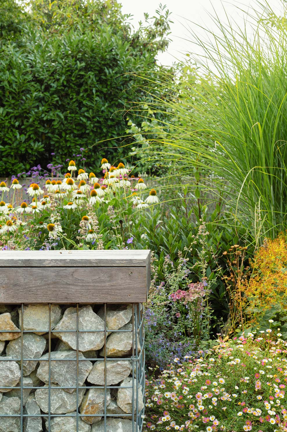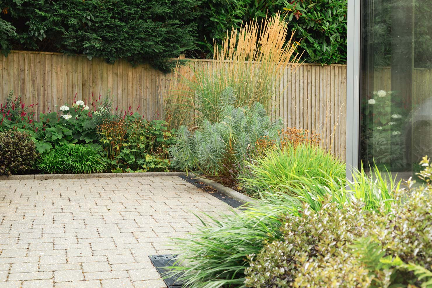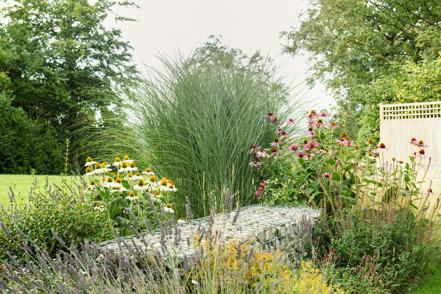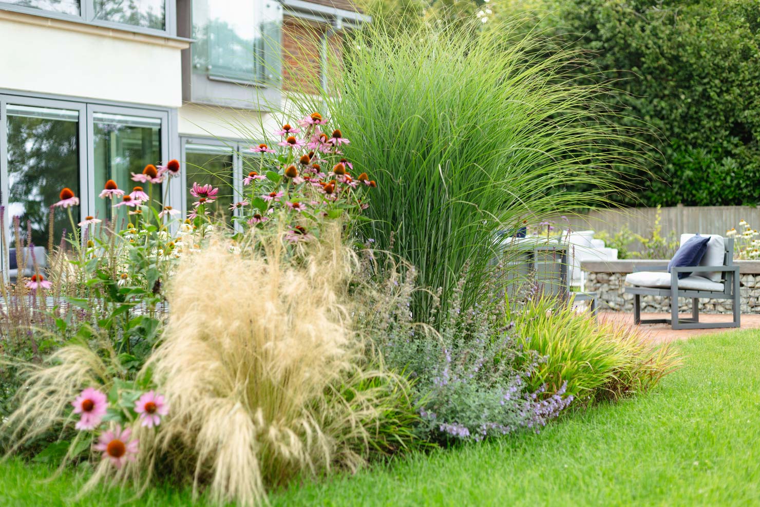 Countryside vista is a garden that softens and harmonises the handsome, contemporary house that it belongs to.  Plant borders in rectangles of differing sizes mimic the striking windows of the modern house and are planted with abundant, softening plants that blend and harmonise the house into its surroundings.  A cream porcelain patio and a red brick terrace extend the entertaining area and tall river birch trees frame the East Sussex countryside views beyond.
