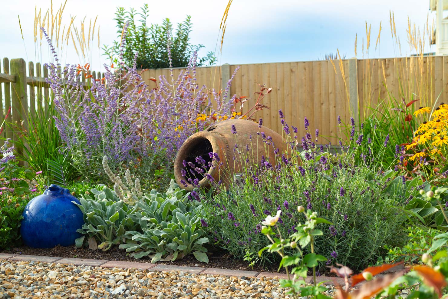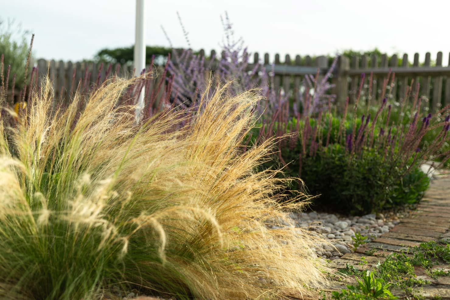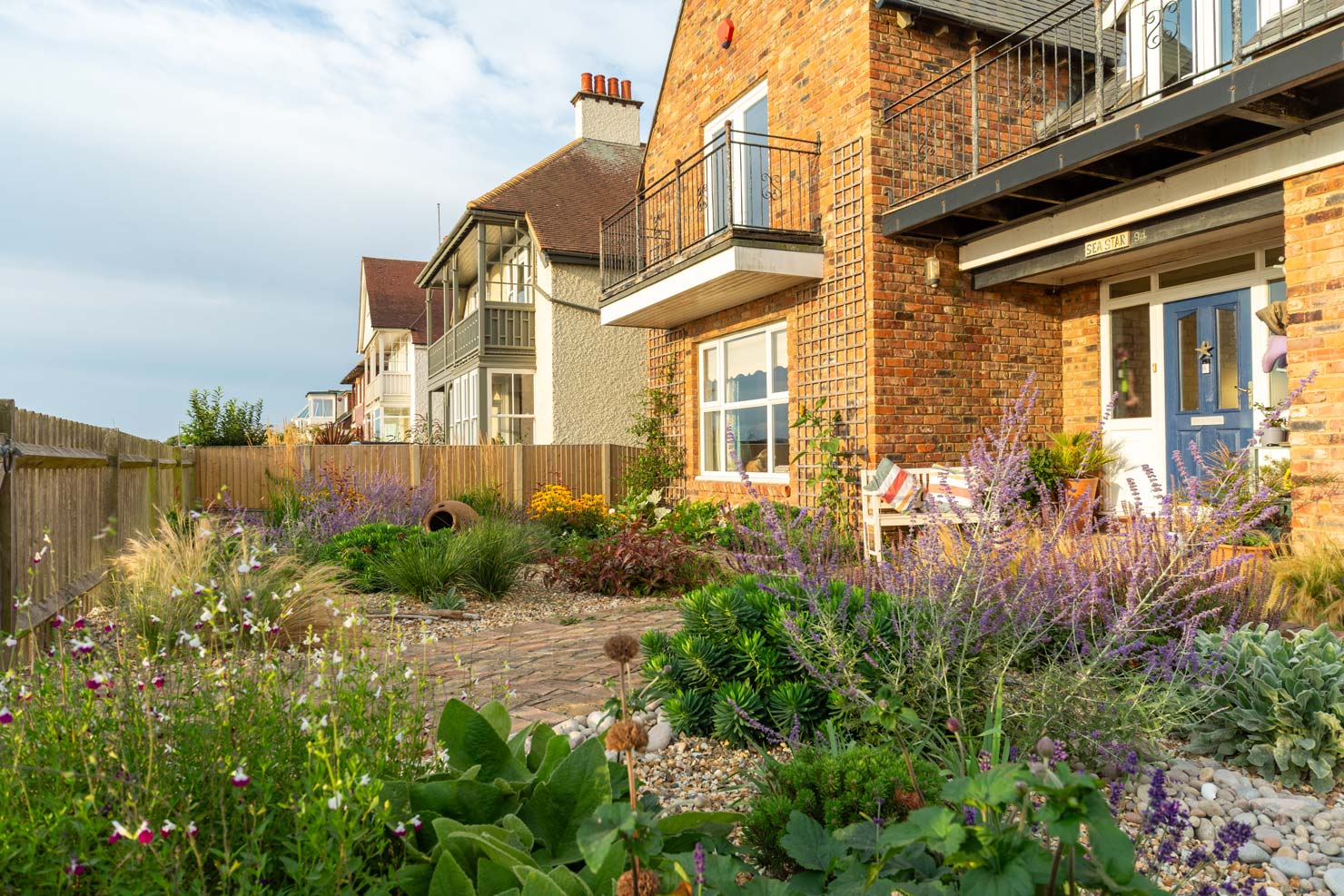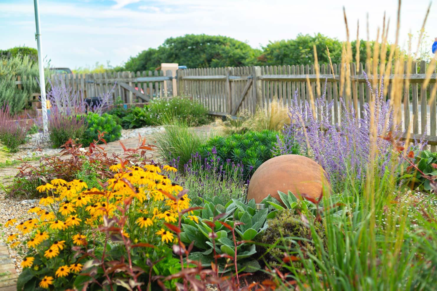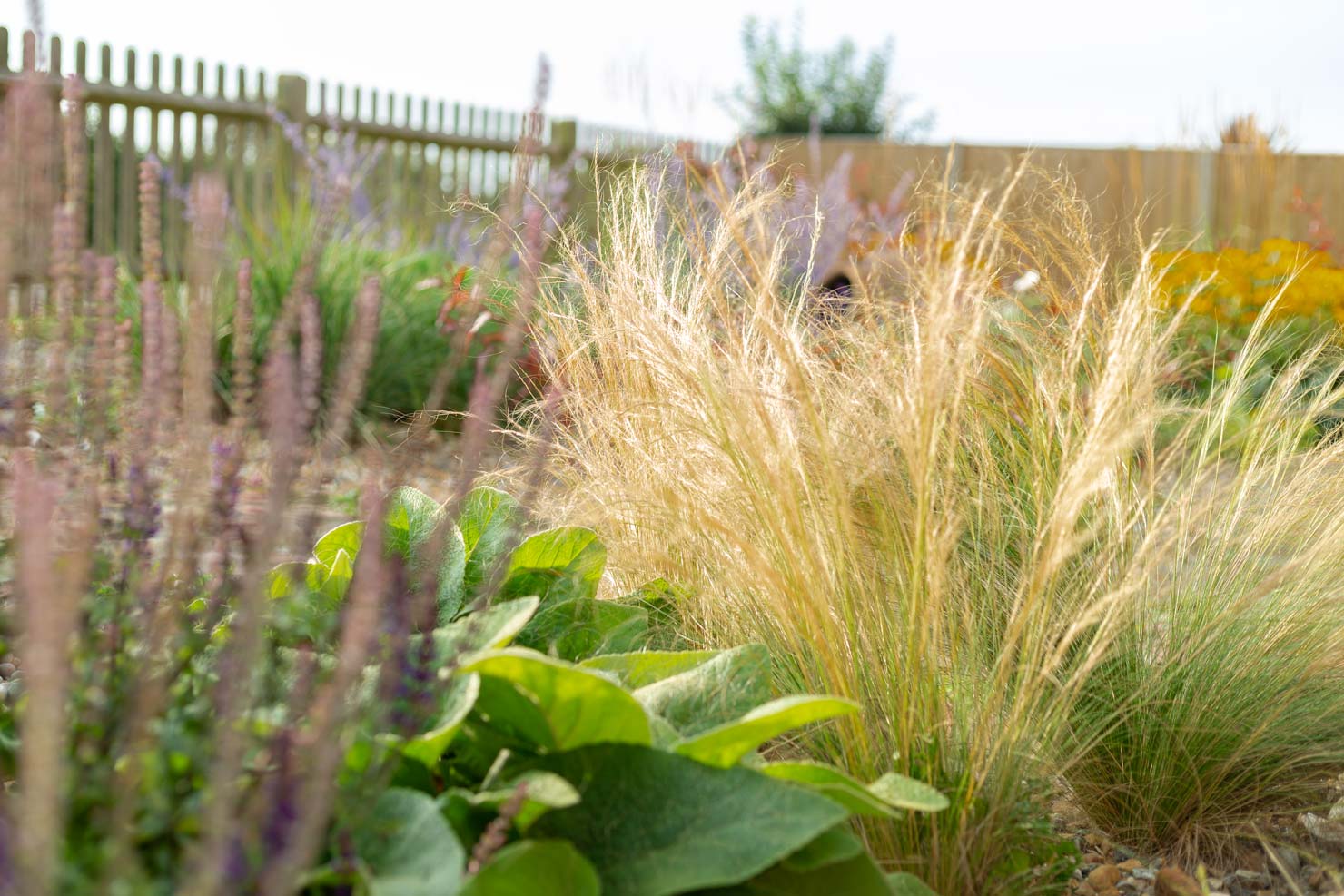 Wild seaside is a coastal garden with shingle and pebbles to blend into the surrounding environment.  Planting is soft and natural whilst being hardy against the intense coastal conditions.  Grasses sway in the breezes and perennials provide colour in the high season.  Planting is in drifts to mimic the waves.