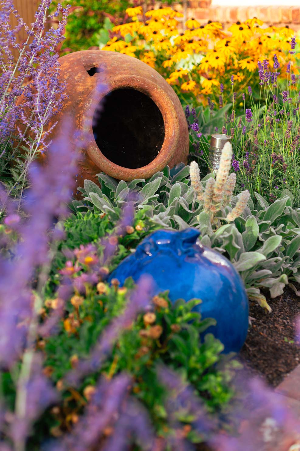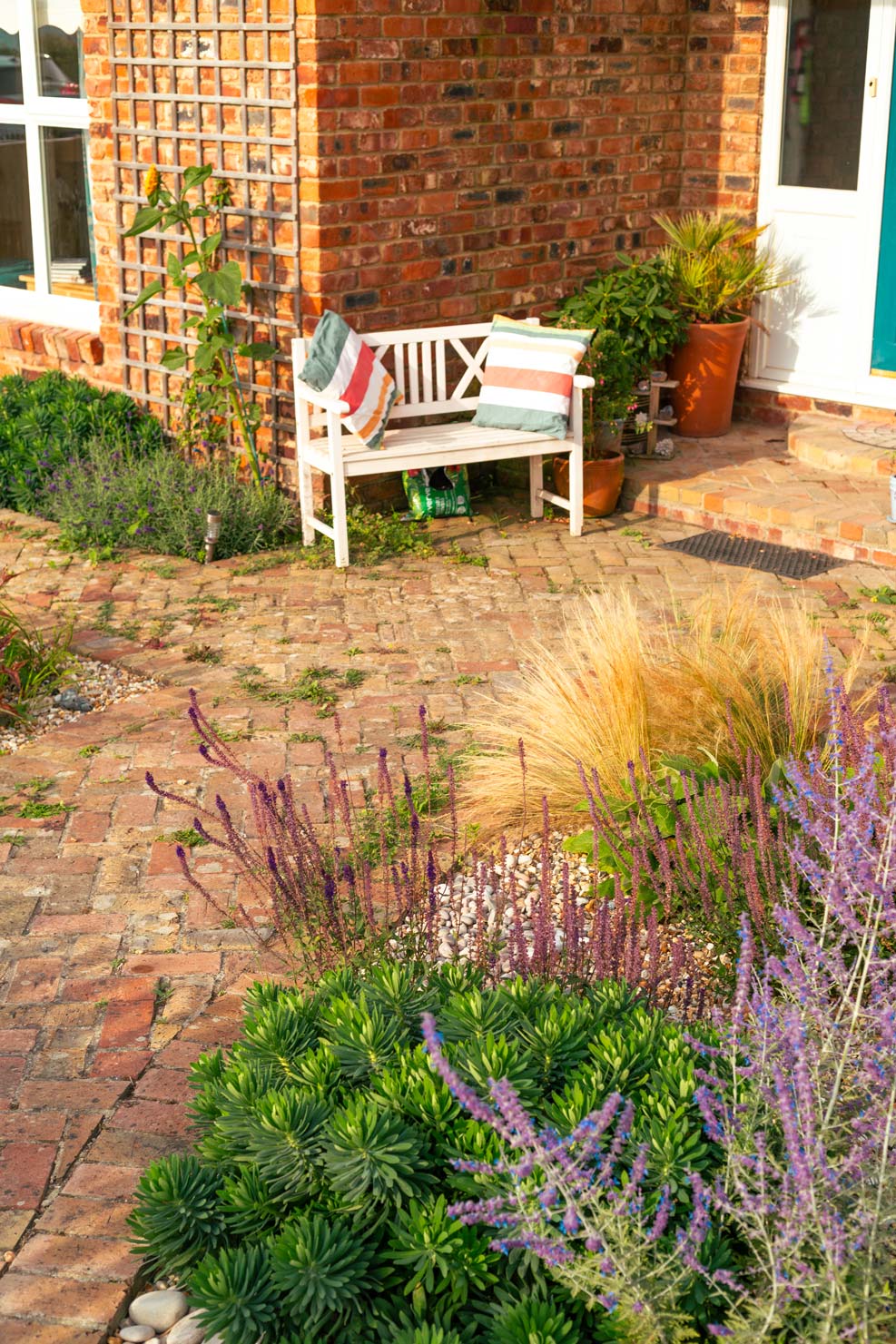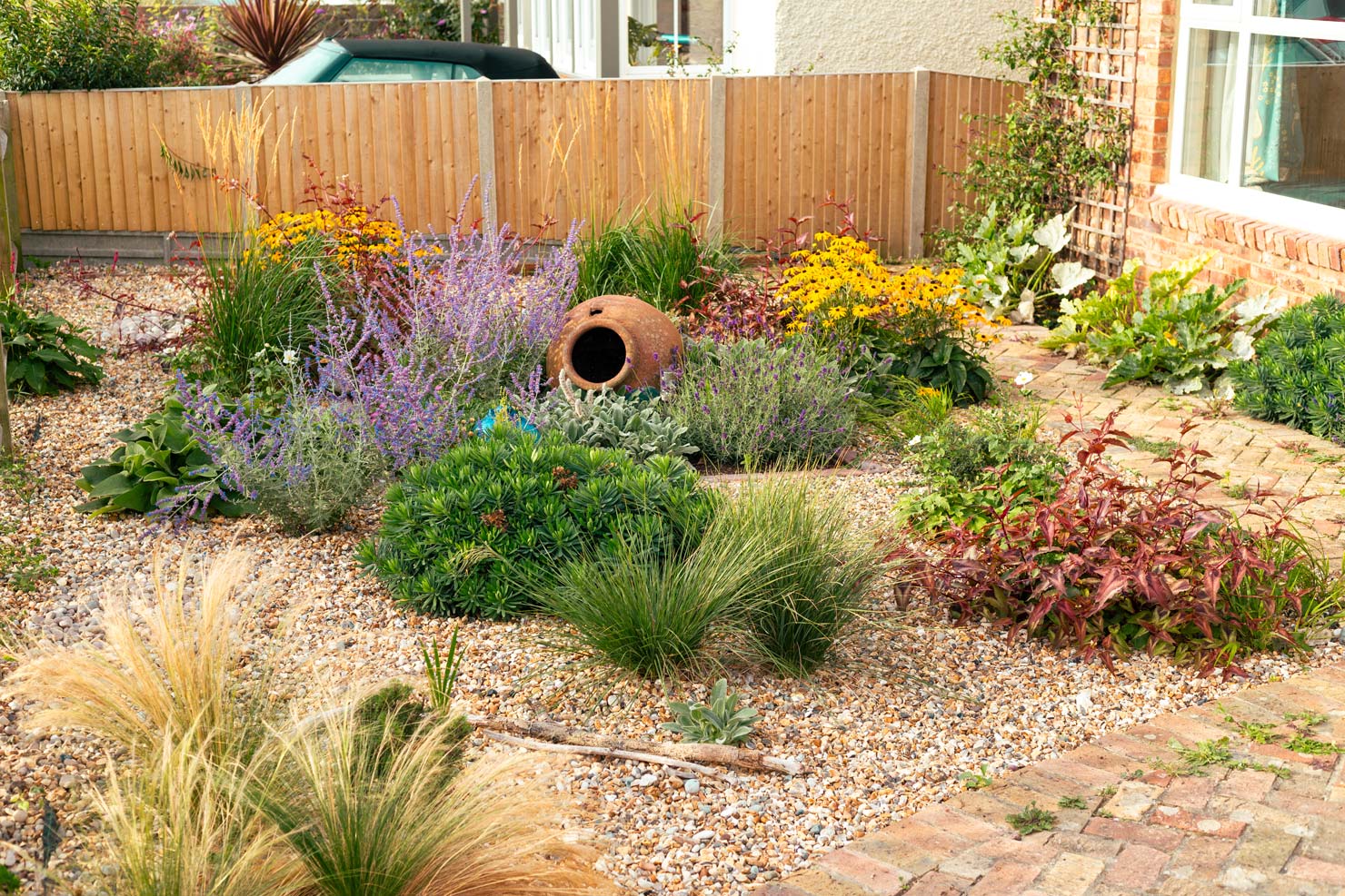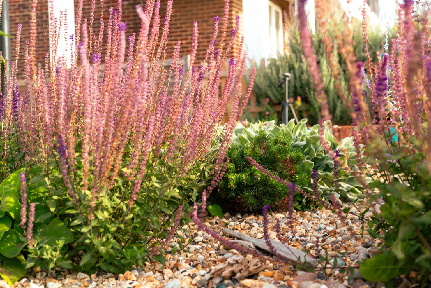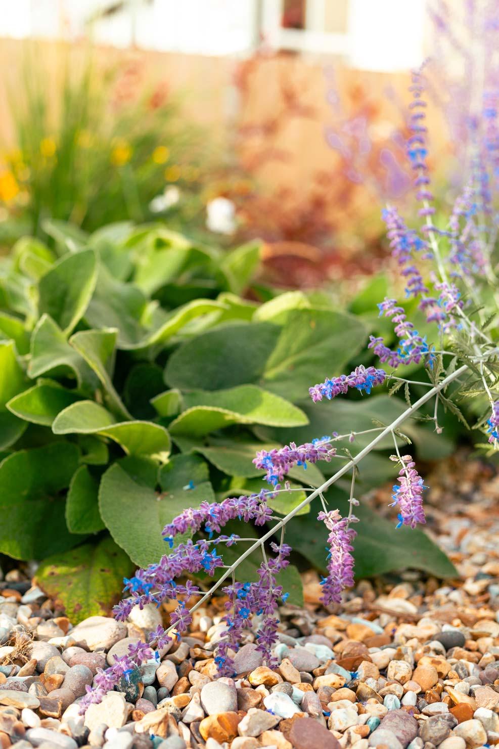 Wild seaside is a coastal garden with shingle and pebbles to blend into the surrounding environment.  Planting is soft and natural whilst being hardy against the intense coastal conditions.  Grasses sway in the breezes and perennials provide colour in the high season.  Planting is in drifts to mimic the waves.